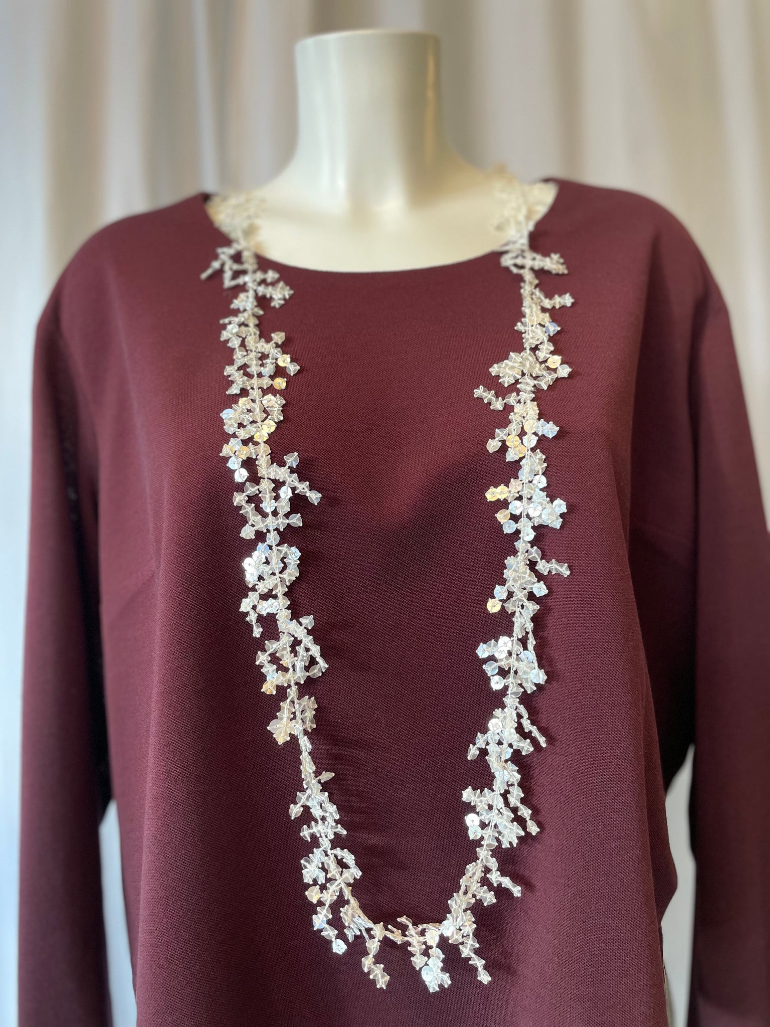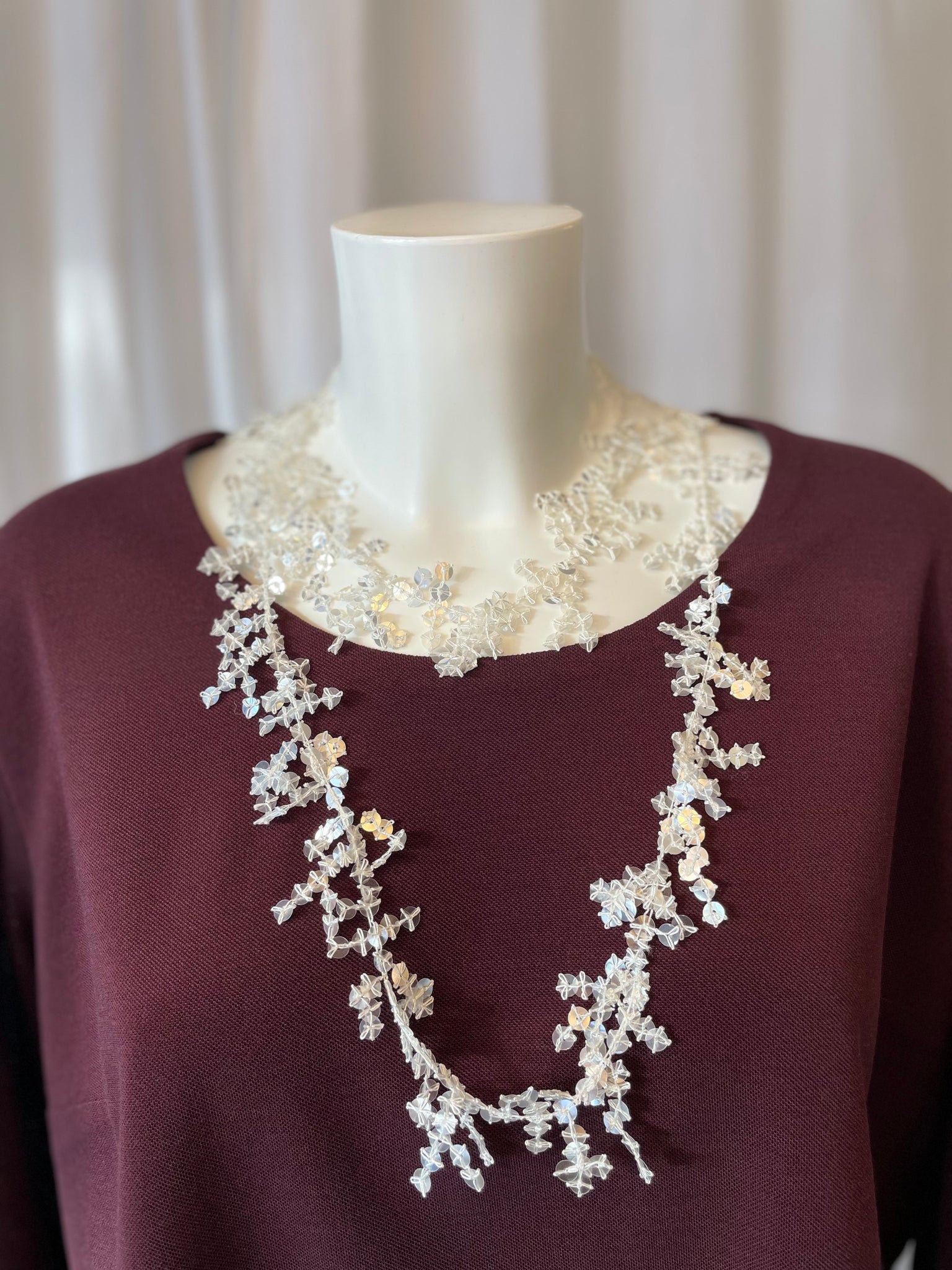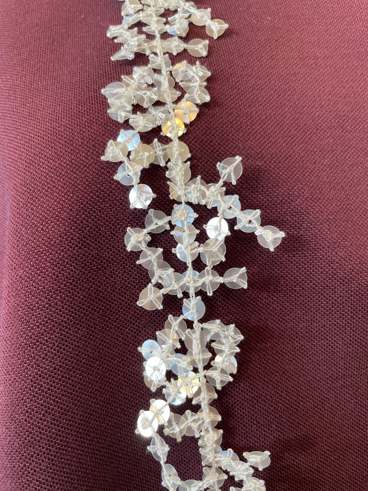 Genähter Halsschmuck aus Pailletten, in floralem Muster. Kann lange wie auch doppelt um den Hals getragen werden.