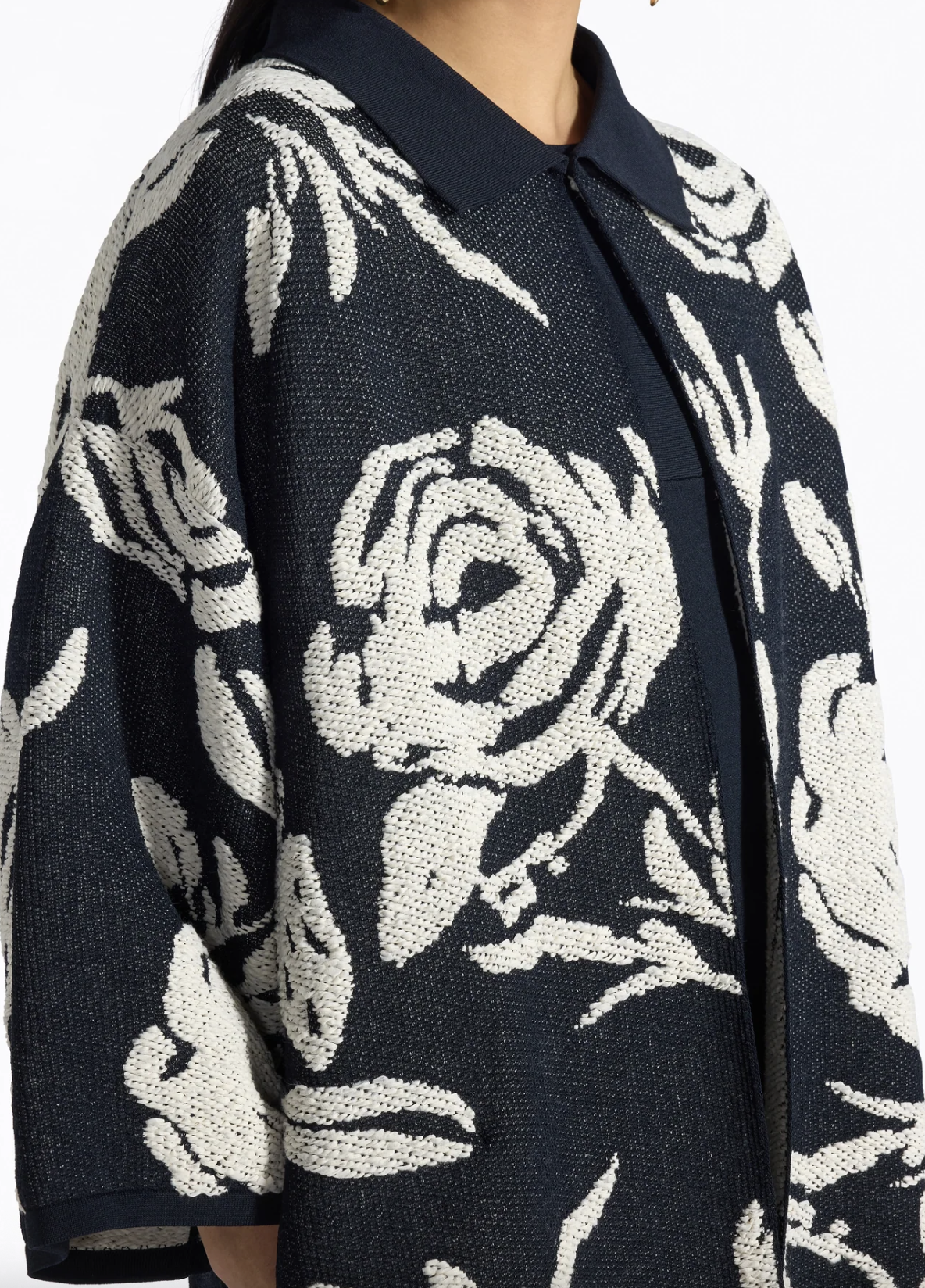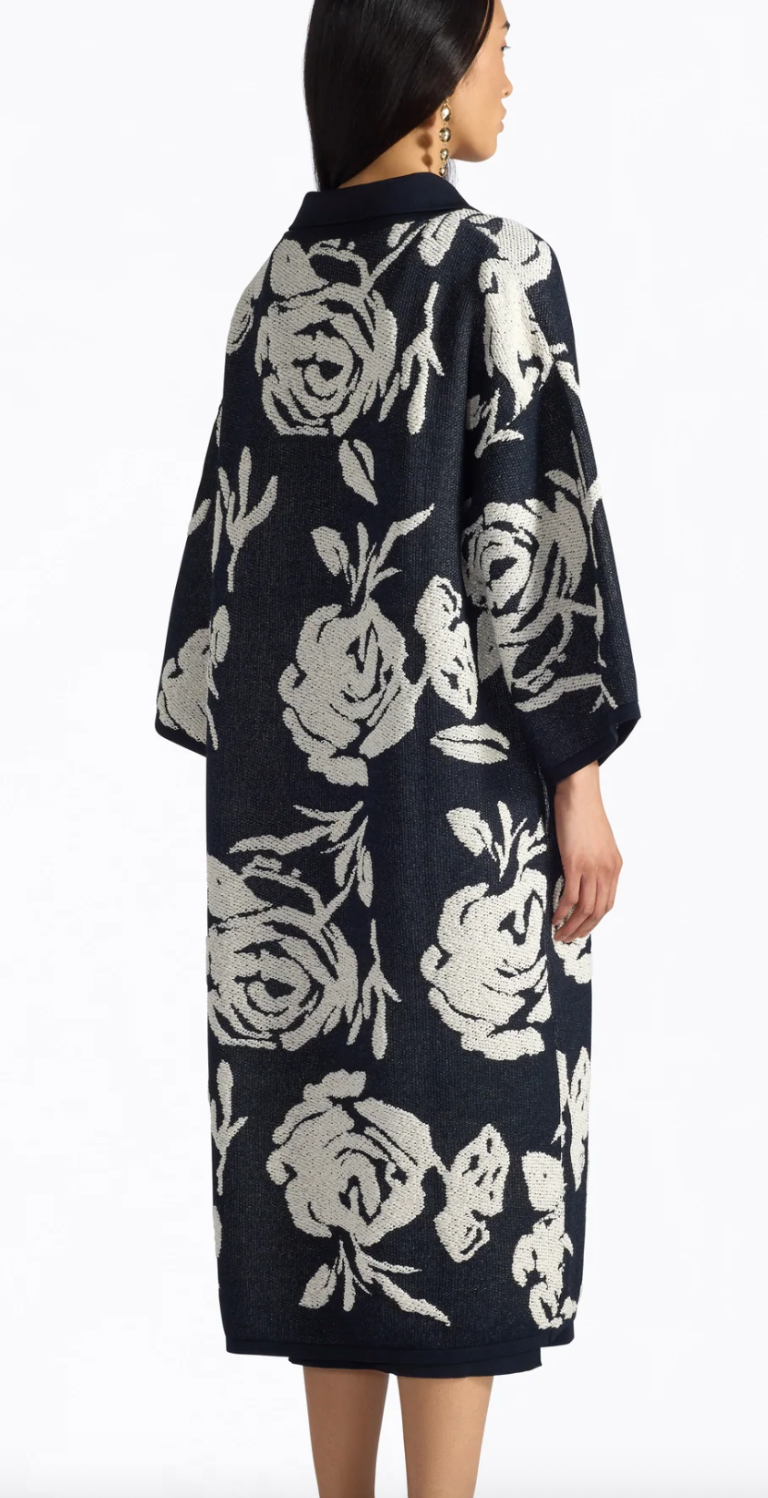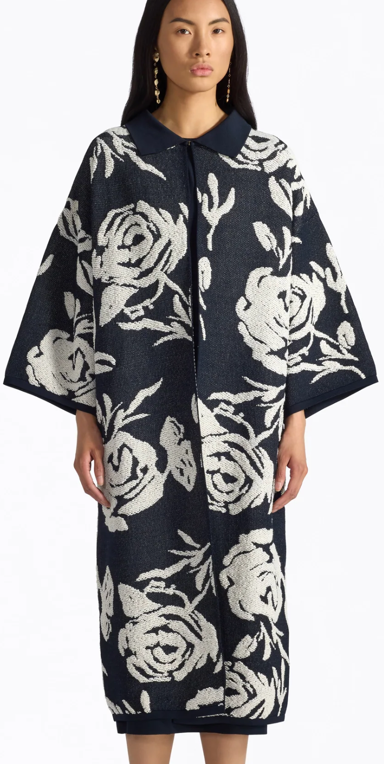 Wadenlanger Strickmantel mit eingestricktem Blumen Ornament, schmales Bord an Saum und Ärmelsaum. Kragen mit kleinem Hacken. Seitennahttaschen.