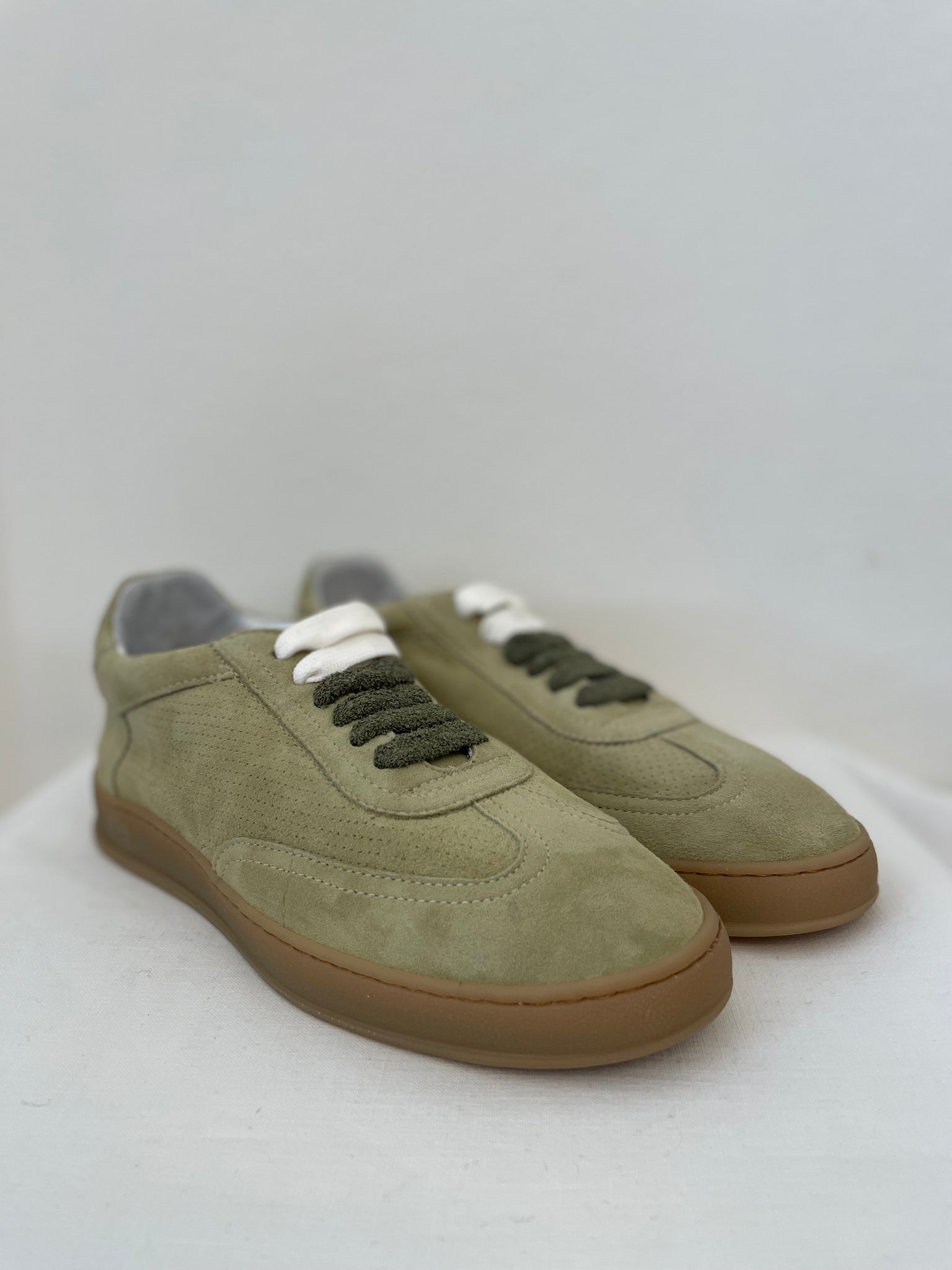 Der Sneaker ist aus weichem Veloursleder gefertigt und bietet dank seines ledergefütterten, herausnehmbaren Fußbetts und der ultraleichten Gummisohle einen unvergleichlichen Komfort. Der Schuh wird mit einem austauschbaren doppelten Schnürsenkel verkauft, der eine in der passenden Farbe, der andere in einer kontrastierenden Farbe.